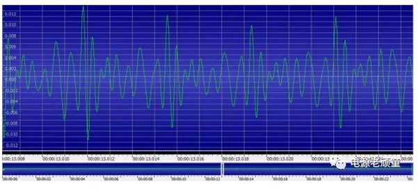 變壓器的嘯叫聲主要是由于變壓器的激磁成分中含有低頻振蕩,使得磁芯的磁分子在這個低頻磁場下運動,產生機械振動,從而引起周圍空氣的振動。由于人耳的可聞頻率大約在20Hz到20kHz,如果這個空氣的振動在此范圍內,后面傳到人耳朵而被聽見。下圖為頻率在2KHz左右的某電源適配器的聲音。