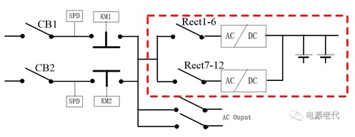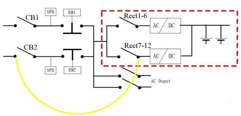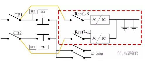 | 在處理完一次鐵路電源系統(tǒng)ATS故障后,曾向鐵路系統(tǒng)維護(hù)人員提出這樣一個優(yōu)化方案:電源適配器整流模塊全實時在線,更是大大提高系統(tǒng)可靠性! 改造前原系統(tǒng)方案如下: ![]() 圖5.1 電源適配器CC級ATS組成系統(tǒng)示意圖 圖5.1為艾默生網(wǎng)絡(luò)能源有限公司PS48600-3/2900-X4系統(tǒng)示意圖,可看出:電源適配器輸入兩路交流市電經(jīng)CC級ATS后到交流母線,交流有幾個支路帶交流負(fù)載,其余主要是給直流系統(tǒng)用(如紅色框中部分); 直流系統(tǒng)是整個電源的核心,需要優(yōu)先保證其可靠性;而直流系統(tǒng)的交流輸入經(jīng)與ATS串聯(lián)后,可靠性大大下降。 5.2 改造后系統(tǒng)方案如下: 5.2.1 兩路市電經(jīng)原電源適配器系統(tǒng)主空氣開關(guān)CB1、CB2后仍接ATS; 5.2.2 艾默生防雷接在ATS前端,且每路市電配一個,所以防雷部分利舊; 5.2.3 原ATS輸出到整流模塊輸入空開匯流排的線&整流模塊輸入空開匯流排拆除; 5.2.4在ATS上端子或CB1輸出端子分別引輸入電纜,直接連到各整流模塊輸入空氣開關(guān); 5.2.5 改造后,只要市電1、市電2任一路有電或都有電,直流母排始終有電,無任何切換,重要的部分可靠性大大提高! 改造后的系統(tǒng),因兩路完全在線,對電池要求可降低; 改造后,ATS觸點不走大電流,ATS自身故障率將降低,也提高交流負(fù)載供電可靠性! ![]() 圖5.2 改造后系統(tǒng)原理示意圖 電源適配器改造方案說明(只是說明工作量和原理) 圖5.3 改造示意圖 保證電源適配器模塊1-6和7-12位置均有相近數(shù)量的模塊;因兩路市電一路優(yōu)先,因此一般是市電一工作;斷開CB2及CB2上級空氣開關(guān),斷開Rect7-12模塊輸入空氣開關(guān)(依據(jù)負(fù)載功率,可以是兩只或三只甚至更多),接圖5.3中黃線所示位置接線;接好線后繼續(xù)保持Rect7-12空氣開關(guān)斷開(改線的幾個都保持?jǐn)嚅_); 電源適配器送CB2上級交流電、維持CB2、Rect2空開斷開狀態(tài):此時,不管ATS狀態(tài),只要交流2有電,負(fù)載就一直正常; 5.3.3 斷開CB1及上級空氣開關(guān),接圖5.3.3綠色線示意,接模塊1-6電纜; ![]() 圖5.3.3電源適配器接線過程 在5.3.3電源適配器部分接線完成,合CB1及上級空開,此時模塊1—6工作將正常,此時系統(tǒng)結(jié)構(gòu)將如5.3.4所示; 5.3.4 接線過程 5.3.5 將CB2及上級空開斷開,同理接Rect7-12模塊空開至CB2下端子線,接好后如圖5.3.5所示,送CB2及上級空開,模塊7-12將正常工作; 圖5.3.5 接線完成后 5.3.6 至此,改造順利完成; 文章轉(zhuǎn)載自網(wǎng)絡(luò),如有侵權(quán),請聯(lián)系刪除。 |