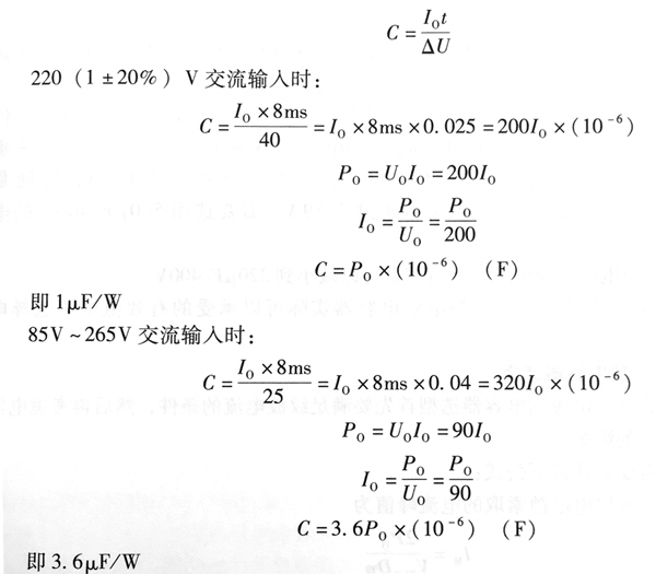 濾波電容器的選擇,為限制整流濾波輸出電壓紋波,正確選擇電容量是非意重要的通常濾波電容器的電容量在輸入電壓220V±20%時按輸出功率選擇為:不低于每瓦1f(即≥1pF/W),輸入電壓85=265V輸入時按輸出功率選擇為:不低于每瓦3μf(即≥3μF/w),濾波電容器電容量的取值依據(jù)為:在220(1±20%)V交流輸人及85~265V交流輸人的較低值時,整流輸出電壓較低值分別不低于200V和90V,在同一輸人電壓下的整流濾波輸出電壓分別的為240V和15.電壓差分別為40和25V?每半個電源周度(0m),整流器導(dǎo)電時間約2ms,其余為濾波電容器放電時間,承擔向負載提供全部電流,即