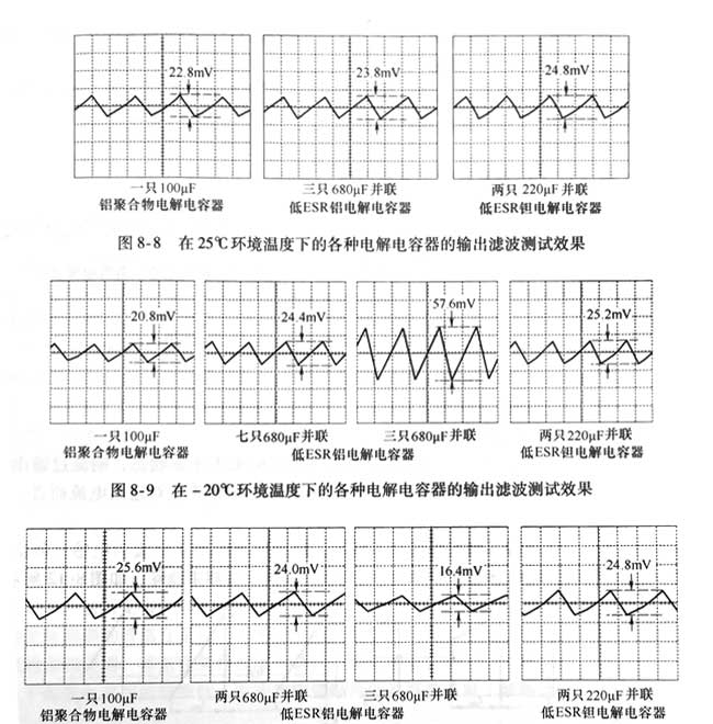 在不同的環(huán)境溫度下的測試結(jié)果分別為圖所示? 從測試結(jié)果看,在開關(guān)頻率為200kHz時,在常溫環(huán)境下,一只100μF的鋁聚合物電解電容器的濾波效果稍好于三只680μF的低ESR鋁電解電容器;稍好于兩只220μF低ESR鋁電解電容器?而在-20℃的環(huán)境下同樣的100μF鋁聚合物電解電容器的濾波效果明顯好于3只680μF低ESR鋁電解電容器,即使選用7只680μF低ESR鋁電解電容器,其效果才能接近100uF鋁聚合物電解電容器,但是還是差一些(差3.6mV,接近18%);稍好于兩只220μF低ESR電解電容器?這表明鋁電解電容器的低溫性能很差,而鉭電解電容器的低溫性能比鋁電解電容器好得多?在70℃環(huán)境溫度下兩只680uF就好于一只100μF鋁聚合物電解電容器;兩只220μF鉭電解電容器與鋁聚合物電解電容器基本相同?實驗結(jié)果表明,鋁電解電容器的性能隨溫度變化非常大,高溫時的性能非常好,常溫特性一般,低溫特性極差。