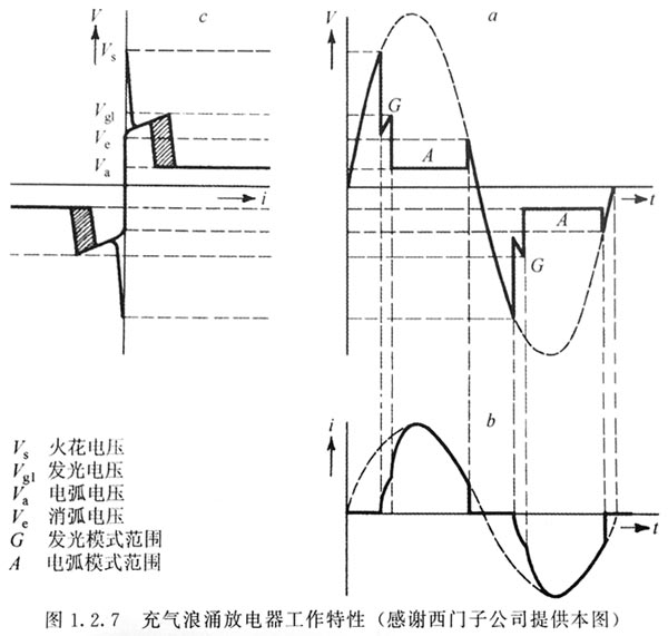 充氣浪涌放電器 大得多的瞬變電流可由各種氣體放電抑制器進行處理。在這類抑制器中,兩個或更多的電極在密封的高壓情性氣體環(huán)境里被精確地設(shè)置了間距。當放電器兩端電壓超過起弧電壓時,電極之間首先發(fā)生電離輝光放電。隨著電流的增大,會發(fā)生電弧放電,這就為所有的內(nèi)部電極之間提供了一條低阻抗的通道。在此模式下,放電器有一條電壓幾乎恒定的傳導(dǎo)路徑,典型的電弧壓降是25V,放電器的特性見圖1.2.7。注意到其特點是高起弧電壓和低電弧壓降。 當沖擊電壓到來時,放電器電極僅維持很小的電壓,有效地短路電源適配器。此工作模式的內(nèi)部損耗很小,一個相當小的器件也能承擔兒千安培的電流。使用這種類型的抑制器,保護作用不是把能量消耗在器件的內(nèi)部而是器件的短路作用,短路迫使瞬變能量消耗在電力線和濾波器的串聯(lián)電阻上。