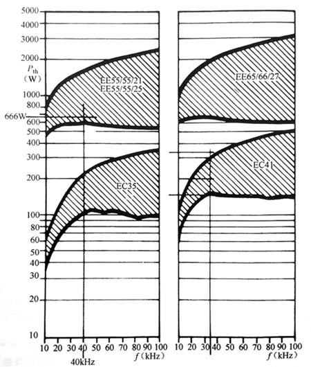 圖平衡推挽工作時的磁心選擇圖,表示輸出功率是頻率的函數(shù),以磁心尺寸為參數(shù)
