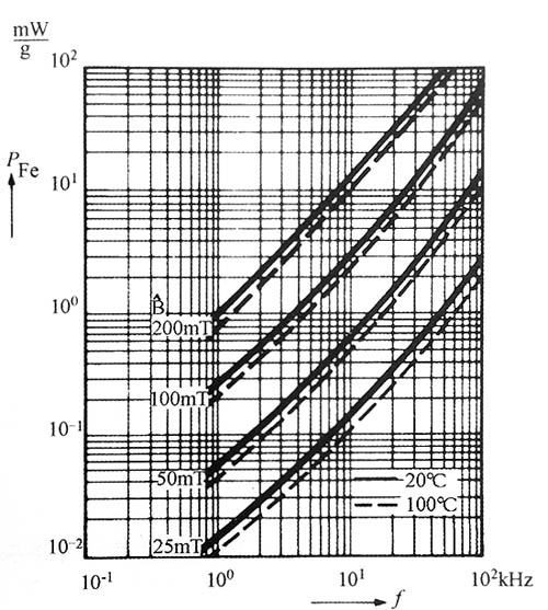 圖每克A16鐵氧體的磁心損耗是頻率的函數(shù),以峰值磁通密度為參數(shù)注:圖中曲線畫的是峰值磁通密度B,磁通密度變化范圍△B是2×B 圖表示一對工作于40kHz的A16鐵氧體EE55-55-21磁心,隨著匝數(shù)的變化其磁心損耗、銅損耗和總損耗的變化情況,峰值磁通密增加到了200mT。較小的總損耗產(chǎn)生在70mT附近。(對于每匝繞組,假設使用了較佳的磁心窗口面積和導線規(guī)格。)