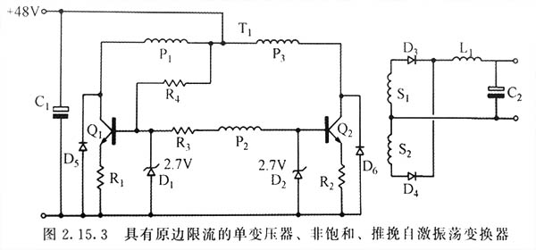 該電路中,集電極電流峰值由選擇的發(fā)射極電阻和鉗位齊納電壓決定,關斷時的較大限制電流不再取決于晶體管增益。 圖電路的整個工作過程如下。合上開關,流經(jīng)R的電流使Q1開始導通,P2產(chǎn)生的正反饋將加強該導通過程,Q1進入全導通的飽和狀態(tài)。 從P2通過R3、Q1基-射結、R1,經(jīng)D2返回建立的驅動電流回路,其作用就像一個正向二極管。較大的驅動電流值使晶體管在整個導通期間都處于完全飽和狀態(tài)。 Q1導通時,集電極電流將隨時間增加,其大小由原邊電感、折算過來的副邊電感L和負載決定。 隨著電流增加,R1兩端的電壓和Q1基級電壓也增加,直到齊納二極管導通。 合理選擇R1的值,使集電極電流達到較大控制值時切斷驅動電流,此時磁心正好進入飽和點,即圖中的點S1’。由于達到鉗位電流時H不能夠進一步增加,所以所有繞組兩端的電壓必須下降到零,后面只需要非常小的反激作用使Q1關斷和Q2導通Q2繼續(xù)完成工作周期。集電極限制電流不再取決于晶體管增益。 當折算過來的負載電流低于磁化電流時,接在集電極上的二極管D5和D6為反向電流提供通路。這兩個二極管以交叉連接方式工作,例如,Q1關斷時,磁化電流將使Q1的集電極迅速變正。同時,Q2的集電極迅速變負,直到D6導通。D6提供的錯位作用使Q1集電極電壓是Vcc的兩倍。為減小漏感的影明,P1和P3應該采用雙股線繞制。 為減少射頻干擾和副邊擊穿應力,除了D5和D6外還需要緩沖電路。 為保證良好的開關作用,需要有足夠的再生反饋,所示電路中P2應提供至少4伏的驅動電壓。