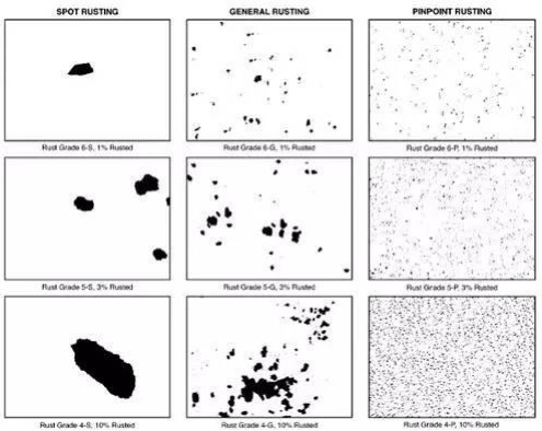S Spot Rusting 幾個大片腐蝕 G General Rusting 尺寸有大有小的腐蝕 P Pinpoint Rusting 微小的點蝕 H Hybrid Rusting 幾種形態(tài)的混合腐蝕 圖示如下: