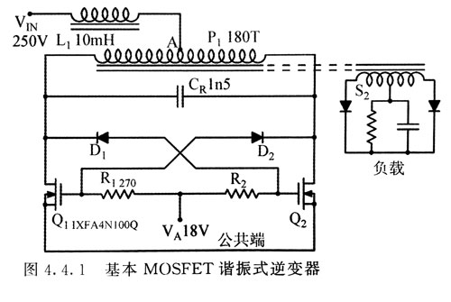 基本MOSFET諧振式逆變器 圖所示的為MOSFET逆變器的較基本電路,通過(guò)該圖可以更好地理解電源適配器的工作原理?然后將分析為了獲得可靠的工作電路,應(yīng)對(duì)其做哪些必要的修改?