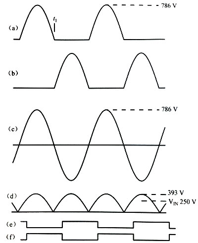 在圖所示的復(fù)讀機(jī)電源適配器基本電路中,柵極驅(qū)動(dòng)電路與雙穩(wěn)態(tài)多諧振蕩器十分相像?電源適配器電路一旦啟動(dòng),就可以在穩(wěn)態(tài)條件下運(yùn)行良好,無(wú)需做任何修改?然而,稍后就可以發(fā)現(xiàn),有個(gè)問(wèn)題使電路不能可靠啟動(dòng),為了解決這一問(wèn)題,應(yīng)做如下的修改? 考慮以下啟動(dòng)條件:輔助電壓VA已經(jīng)建立,輸入電壓VN也已經(jīng)施加,且電路已經(jīng)運(yùn)行于穩(wěn)態(tài)?(本例中相對(duì)于公共端,VA為18VDC,VN為250VDC?) 在這種條件下,并聯(lián)諧振電容CR和原邊P1兩端的電壓為正弦波,如圖所示P1中心抽頭A點(diǎn)的電壓為全波整流后的正弦電壓(或選加正弦波,如圖4?4?2d所示)由于L1的輸入端接至直流電壓(Vw),L兩端的電壓為類(lèi)似的帶有直流偏置的選加正弦波?注意圖4?2?2中除P1電壓以外,電壓的參考點(diǎn)均為公共端? 為了使輸入電壓的紋波較小,扼流圈L1的電感值相當(dāng)大(本例中為10mH),電流中的直流分量相對(duì)于交流紋波電流來(lái)說(shuō)很大,因此扼流圈的電流近似恒定?A點(diǎn)的選加正弦波電壓由L1的工作狀態(tài)以及由變壓器原邊電感和C構(gòu)成的諧振電路完全決定?