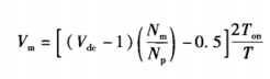 從式可以看出,當輸入V變化時,為保持Vm恒定,負反饋就會起作用,使輔輸出也保持不變。根據式,輸入變化時,反饋環會改變導通時間T使得(Vdc-1)Ton的值保持不變,以維持V恒定。相同的(Vdc-1)Ton也出現在式和式中,因此Vdc改變時,Vs1和Vs2也保持恒定。