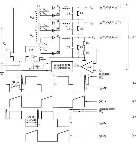所有次級繞組的脈沖寬度都相同,均由主輸出回路的負反饋控制電路決定。其控制電路與圖所示的Buck調整器和圖所示的 Boost調整器的控制電路相似,不過在推挽電路中,開關管Q1和Q2由兩個相等的脈寬可調、相位互差180°的脈沖驅動。另外兩個次級繞組Ns1和Ns2。為輔輸出。