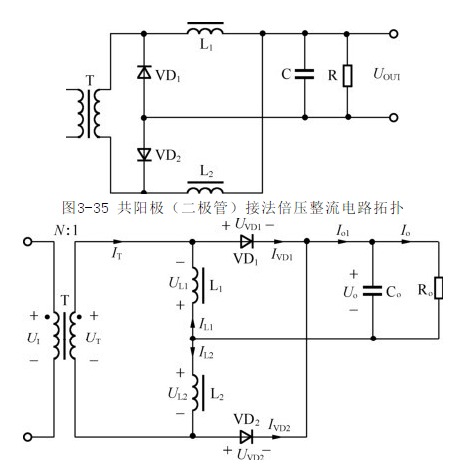 當副邊繞組的上端電壓為正時,副邊電流經過L1、C和R、VD2再回到副邊繞組;當副邊繞組的下端電壓為正時,副邊電流經過L2、C和R、VD1再回到副邊繞組。倍流整流電路按照這一過程,將高頻交流方波電壓整流為直流輸出電壓。圖3-36所示電路的工作原理與圖相同。