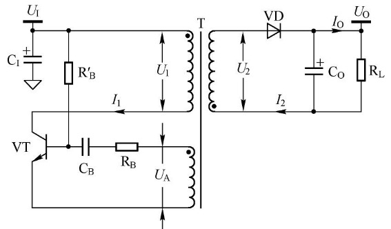 圖為自激式電源適配器的基本電路。UI是輸入交流電壓經整流的直流電壓;CI是整流電壓的濾波電容;是功率開關管VT的啟動電阻;RB、CB與變壓器輔助繞組構成VT的振蕩電路;T是開關變壓器,一次繞組用于儲能及一、二次繞組之間的能量耦合,輔助繞組產生正反饋信號;整流二極管VD和電解電容CO組成整流濾波電路,輸出平滑的直流電壓UO給負載RL供電。