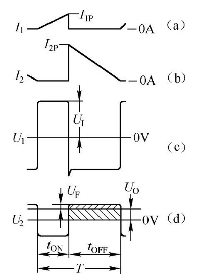 關鍵節點電壓和支路電流波形如圖3-2所示。在VT導通(tON)期間,變壓器T一次繞組從電源電壓UI蓄積能量;在VT截止(tOFF)期間,變壓器T蓄積的能量釋放給負載。在VT從導通到截止轉換瞬間,變壓器一、二次繞組依次出現峰值電流I1P、I2P(3)(見圖(a)、(b))。一、二次繞組均為脈沖電壓,且相位相反(見圖(c)、(d))。UF為整流二極管導通壓降,U2的正脈沖等于輸出直流UO與UF的疊加。