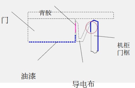 再看看機柜門框, 油漆保護位置同樣不夠, 門框與導電布接觸部位正好也被油漆所覆蓋(如圖中紅色圈所示)。因此在這種情況下導電布雖然貼了,但電磁屏蔽效果并不佳。