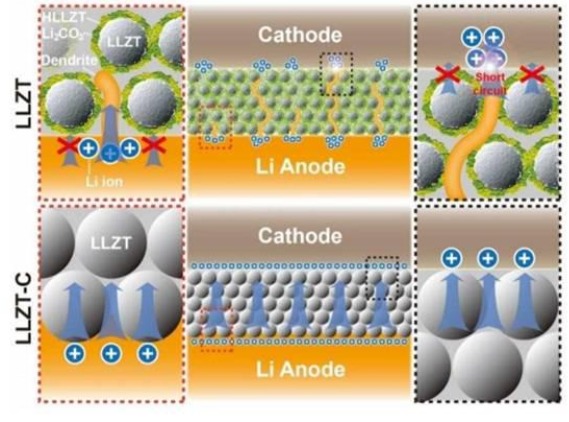 圖一, 石榴石型 LLZT 和 LLZT-C 全固態電解質鋰金屬電池的示意圖。