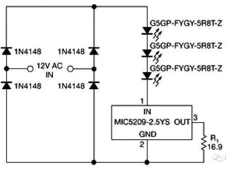 該電路采用價格合理的150毫安暖白色發(fā)光二極管、低成本的整流二極管、2.5V MIC5209-2.5-YS穩(wěn)壓器。該穩(wěn)壓器必須至少提供所需的發(fā)光二極管電流,并且處理峰值輸入電壓,減小四個整流二極管兩端和發(fā)光二極管串兩端的壓降。