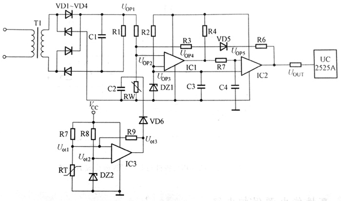 圖2-65高性能保持電路圖 ①鑒流線圈能較大程度地感應到主振蕩管電流的變化情況 ②T1鑒流線圈后級接法基本上是通用型PWM整流?濾波線路?相對于一般鑒別電源適配器總電流的方法,它的鑒流輸出功率大,易于后級的再處理,鑒流輸出的電壓Vom隨電源輸入電壓變化較小,其值主要取決于振蕩管上的電流脈動波形的積分?這樣,就使輸入電壓的低端與高端能得到基本相同的過流保護特性。 RW為人工設定過流保護點的調節(jié)電位器;R3?R6?R9為正反饋電阻,用以設定保護點的閾值電壓;Rr為正溫度系數(shù)的熱敏電阻?電源適配器正常工作時,Uom<<Uom,運算放大器IC1的輸出電壓Uo等于其截止電壓,約為0.2V,運算放大器IC2的輸入端電壓Uoe<<Uom,Uour等于其截止電壓,約為0.2V?通過電阻將其接于UC2525A的⑩腳,此電平足以保證電路正常工作?一且輸出出現(xiàn)過載或短路現(xiàn)象,Uom>Uom,運算放大器IC1的輸出電壓Uom變高,等于運放較大輸出電壓幅度,約為Vc-2V?此時,電源馬上給電容C4充電,使運算放大器IC2的輸入端電壓Uon>>Uom,Uour變高,此電平足以保證電路UC2525A完全關閉,使電源進入停止工作期?在此期間,鑒流輸出電壓Uo為零,Uom<<Uom,運算放大器IC1的輸出 電壓Uom又將等于其截止電壓,約為0.2V?此時,因為電容C4上的電壓Uom不能突變,必須通過電阻R7放電,R7?C4取值較大,通過改變R7或C4的值來調節(jié)停止工作期的時間?只有當Uoms放電到Uo<Uom時,Uour才變低,電源重新進入正常工作狀態(tài)?如果過流狀態(tài)依然存在的話,電源又將進入停止工作期?如此周而復始?在保護期間,UC2525A推動級上的工作波形如圖2-66所示? 調節(jié)R7?C4值,使T2>>T1,保證電源適配器在真正意義上進入睡眠狀態(tài)?從電路分析可以看出,因為有了R7?VD5?C4組成的充?放電回路,通過二極管VD5充電快而放電慢,加之R3?R7正反饋電阻設定閾值保證Uout的輸出狀態(tài)只有兩種,即高電平或低電平?如果沒有R7?VD5?C4組成的充?放電回路,則T2約等于T1,對 UC2525A的⑩腳電壓來說將出現(xiàn)0.6~0.8V頻繁變化,將使電源處于頻繁的啟動與關閉狀態(tài),對振蕩管極為不利,也較容易損壞功率管? 借助上述電路,可以很容易地構成輸入過/欠壓保護電路?輸出過/欠壓保護電路以及過熱保護電路?在此,僅以附加過熱保護為例,說明如下?如圖2-65所示,過熱保護電路由IC3及其周邊元件組成?當電源適配器的溫度沒有超過設定溫度時,Um1<U?2,運放IC3的輸出電壓U?為低電平?由于有二極管VD6的存在,此時IC3的輸出電壓Uo不會影響到UoP?也就是說在過熱保護電路未起作用時,它不會影響到上述的過流保護電路的性能?當電源適配器溫度降低到超溫保護點以下時,電源才能重新進入正常工作狀態(tài)?依此類推,可以構成其他輸入輸出過/欠壓保護電路?在此,不再一一贅述? 根據(jù)上述設計原則,同樣可以類推出諸如F494?F3825A?F384X系列?F3524等幾乎所有PWM型芯片所組成的各種電路形式?