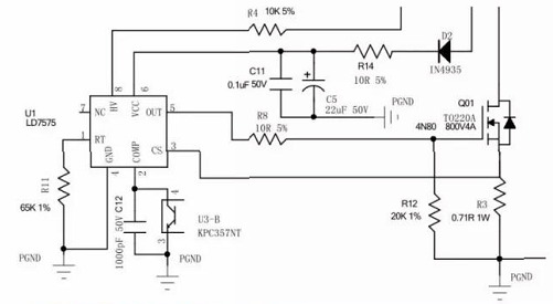 R11為lC工作頻率調整電阻, 02為輔助繞組供電整流二極管 R14為限流電阻, C5為低頻濾波電容, C11為高頻濾波電容, R3為過功電阻, R8為驅動電阻, R12 MOS開機保護電阻, C12為旁路電容, U3-B為光耦反饋端,