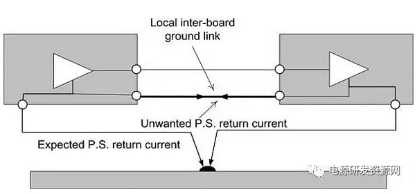 如果你試圖為感興趣的信號提供局部板間地線來解決這些問題的話,你可以需要冒為電源適配器返回電流提供另一條路徑的風險,從而達不到局部地線的目的。只有一部分電源適配器返回電流將在本地鏈路中流動(圖1.13),具體比例取決于相關阻抗,你可能會退回到起點。