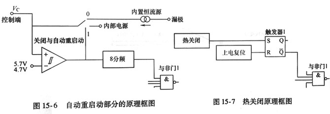電源適配器熱關(guān)閉 如果由于某些原因使得電源適配器芯片過熱,則芯片內(nèi)部的過熱關(guān)閉起作用,輸出低電位使得與非1的熱關(guān)閉輸入端為低電位,迫使開關(guān)管關(guān)斷,直到芯片溫度降低到熱關(guān)閉重新釋放? 熱關(guān)閉對(duì)應(yīng)的芯片溫度的典型值為135℃,與集成穩(wěn)壓器熱保護(hù)原理不同, TOP Switch熱關(guān)閉后不再自動(dòng)重啟動(dòng),即熱關(guān)閉將RS觸發(fā)器1Q非端被置0?需要重新上電,將觸發(fā)器1復(fù)位?這種做法可以提高應(yīng)用可靠性,不會(huì)因?yàn)樵谶^熱狀態(tài)下自動(dòng)重啟動(dòng)而燒毀開關(guān)管? 熱關(guān)閉原理框圖如圖15-7所示?