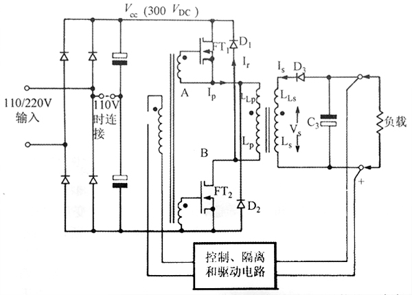對(duì)角半橋正激變換器,別名雙晶體管正激變換器,它的原邊功率開關(guān)的接法類似于在反激變換器中的接法。圖表示了該功率系統(tǒng)的一般電路。 這種結(jié)構(gòu)特別適合于場(chǎng)效應(yīng)晶體管(MOSFET)的工作,因?yàn)槟芰炕謴?fù)二極管D1和D2在開關(guān)元件上對(duì)充電器開關(guān)元件提供了強(qiáng)烈的鉗位作用,防止了反激作用時(shí)任何的過電壓。功率開關(guān)管兩端的電壓將不會(huì)超過充電器電壓加兩個(gè)二極管管壓降,因此電壓應(yīng)力僅為單端變換器中單個(gè)晶體管所受應(yīng)力的一半。 該例中已給出兩種輸入充電器電壓規(guī)格供選擇,通過撥動(dòng)連桿LK1,用戶可選擇110V或220V作為輸入電壓。 110V工作時(shí)使用倍壓,因此無論是110V還是220V工作時(shí),直流電壓V都接近于300V。高充電器無負(fù)載時(shí)的較大電壓將接近于380V,因此為保險(xiǎn)起見,可以選擇額定電壓為400V的功率MOSFET(有些MOSFET高溫工作時(shí)電壓額定值下降,這一點(diǎn)應(yīng)該考慮)。