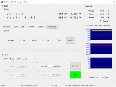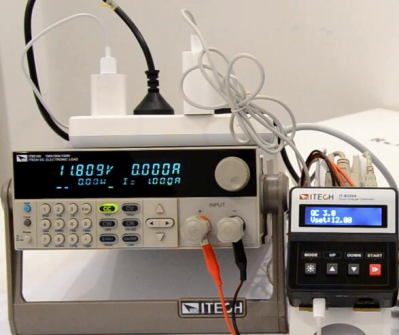 | 今年是USB 充電器爆發的一年。無論是手機、平板、還是筆記本電腦,越來越多的消費類電子產品都不約而同的用上了TYPE-C接口,支持USB PD充電協議。 一款快充充電器好不好,首當其沖的肯定是兼容情況,其次是輸出帶載能力。 較近購買一款小米45W的PD充電器,同時兼容QC2.0、QC3.0快充協議。 市面上多數電子負載并不支持快充協議,而艾德克斯電子新出的IT-E255A快充控制盒卻可以搭配目前多數電子負載進行快充協議的測試。 這個小小的快充控制盒不僅支持QC2.0/QC3.0/PE/PE2.0/USB PD,更重要的是竟然可以和艾德克斯的IT8500+系列的電子負載通信,設定負載的拉載模式和拉載值。 下面就和小伙伴們一起分享小米USB-C充電器的測試。 1.開始準備階段 IT-E255A的輸入口有Mini-USB和TYPE-C 2個接口。 充電器插入口,IT-E255A連上電子負載,測試就可以開始嘍。 1.1 IT-E255A自動進行充電器協議檢測,Type-C輸出口支持USB PD2.0 、QC3.0、QC2.0三種快充協議。 1.2 從IT-E255A顯示屏中可以看出,小米USBPD充電器的快充協議版本為2.0,支持5V/3A、9V/3A、12V/3A、15V/3A、20V/2.25A五個輸出檔位。 1.3 在5V/3A、9V/3A、12V/3A、15V/3A、20V/2.25A五個PD輸出檔位,分別拉載較大的電流,測試其在不同檔位下輸出的電壓和輸出功率。 ![]() 歐規充電器測試接線圖(小米充電器+ 艾德克斯IT-E255A + 艾德克斯IT85150) USB PD 2.O POS1 5V/3A ![]() USB PD 2.O POS2 9V/3A ![]() USB PD 2.O POS3 12V/3A ![]() USB PD 2.O POS4 15V/3A ![]() USB PD 2.O POS5 20V/2.25A ![]() 2.手動按鍵按下“Mode”,選擇QC3.0,點擊“START”,IT-E255A則可誘導小米USB-C充電器從5.0V開始以0.2V的步進值步進,充電器可按照快充控制盒的設定值輸出。 2.1 在QC3.0模式下,誘導充電器輸出6.0V、7.0V、8.0V、9.0V,分別使用電子負載恒流模式拉載,測試其電壓、輸出功率。 ![]() 3. 如果不喜歡手動操作,還可以使用上位機軟件控制。 使用USB數據線將IT-E255A和計算機相連。下載相應免安裝的上位機軟件,打開后就可以使用。 下面做了兩個測試:QC2.0 9.0V輸出: QC2.0 12.0V輸出: ![]() 操作清晰簡易,可以顯示拉載的電壓、電流、功率的波形曲線,自由控制電子負載, 另外還可以設置list自動測試,快速進行判斷、OCP測試等。此外還可以下載到快充控制盒中,與電腦脫機使用,一鍵操作,非常快捷。