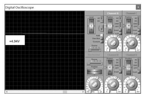 加入300Ω電阻與LED負載后,由穩壓器輸出的直流電壓大小為4.93V,并可將LED點亮。用示波器監視穩壓電路輸出VO,結果如圖所示。