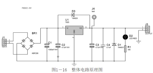 綜上所述,本項目所設計的固定式直流穩壓電源適配器,能夠在負載變化的情況下提供穩定的+5V直流穩壓電源適配器。固定式單電源適配器直流穩壓電路整體電路原理圖如圖所示。