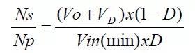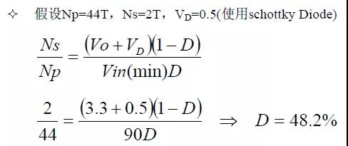 2)決定一次側(cè)濾波電容: 濾波電容的決定,可以決定電容器上的Vin(min),濾波電容越大,Vin(win)越高,可以做較大瓦數(shù)的Power,但相對價(jià)格亦較高。 3)決定變壓器線徑及線數(shù): 當(dāng)變壓器決定后,變壓器的Bobbin即可決定,依據(jù)Bobbin的槽寬,可決定變壓器的線徑及線數(shù),亦可計(jì)算出線徑的電流密度,電流密度一般以6A/mm2為參考,電流密度對變壓器的設(shè)計(jì)而言,只能當(dāng)做參考值,后面應(yīng)以溫升記錄為準(zhǔn)。 4)決定Duty cycle(工作周期): 由以下公式可決定Duty cycle ,Duty cycle的設(shè)計(jì)一般以50%為基準(zhǔn),Duty cycle若超過50%易導(dǎo)致振蕩的發(fā)生。