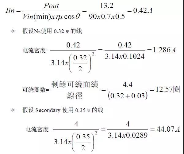公式中,如此可得出B(max),若B(max)值太高或太低則參數(shù)必須重新調(diào)整。 變壓器計(jì)算: 輸出瓦數(shù)13.2W(3.3V/4A),Core = EI-28,可繞面積(槽寬)=10mm,Margin Tape = 2.8mm(每邊),剩余可繞面積=4.4mm。 計(jì)算式: 變壓器材質(zhì)及尺寸:由以上假設(shè)可知材質(zhì)為PC-40,尺寸=EI-28,Ae=0.86cm2,可繞面積(槽寬)=10mm,因Margin Tape使用2.8mm,所以剩余可繞面積為4.4mm。假設(shè)濾波電容使用47uF/400V,Vin(min)暫定90V。 8)決定變壓器的線徑及線數(shù):
