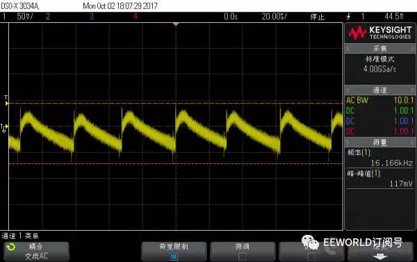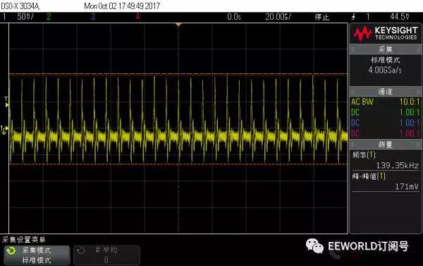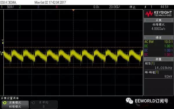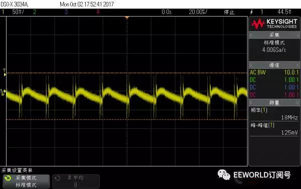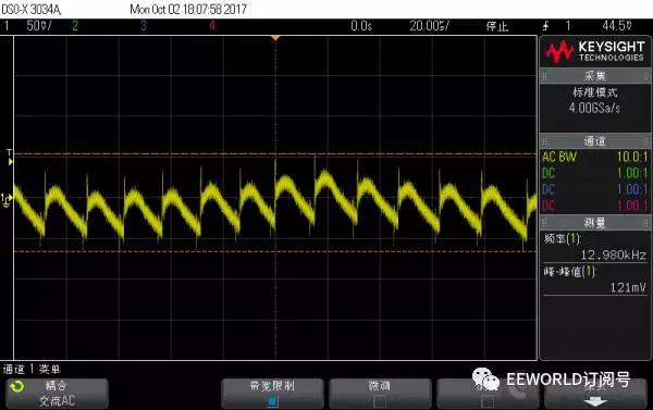 上面兩圖對比:隨著電流增大,開關頻率變大,但是紋波峰峰值反而有所下降,不過都在120mV以上 Apple 10W 充電器 1A 帶載波形