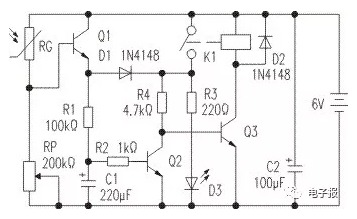 | 電路功能介紹: 本電路可實現(xiàn)通過光敏電阻“點動”控制LED的顯示,即用光照射一下光敏電阻RG,就可實現(xiàn)LED亮,再用光照射一下光敏電阻RG(時間要比上次要久些)可實現(xiàn)LED熄滅。電路見附圖1所示: